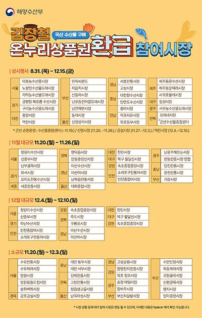 소비자들은 해당 90개 시장에서 국산 수산물을 구매한 후 행사 부스에서 구매 금액에 따라 1만 원 또는 2만 원 상당의 온누리상품권을 환급받을 수 있다. 구매금액이 2만5000원 이상 5만원 미만일 경우 1만원, 구매금액이 5만원 이상일 경우 2만원이 환급된다.