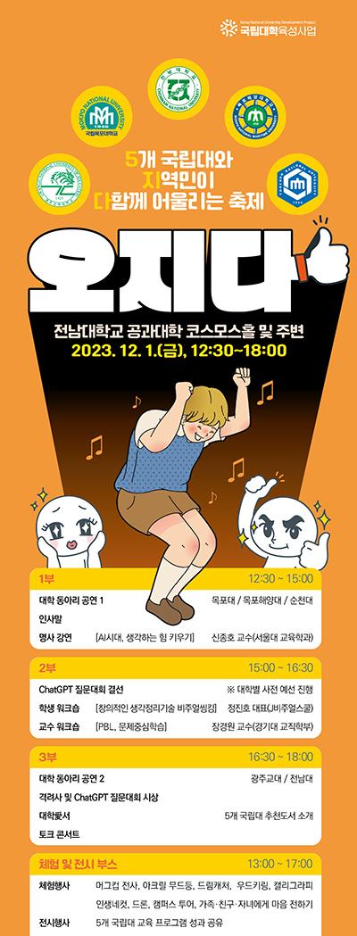 전남대학교는 다음달 1일 공과대학 코스모스홀에서 광주와 전남지역 5개 국립대학이 참여하는 \'오지다\' 축제가 열린다고 19일 밝혔다.