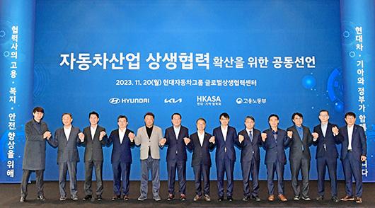 고용부와 현대차·기아는 20일 오후 경북 경주 현대자동차 글로벌상생협력센터에서 \'자동차산업 상생협력 확산을 위한 공동선언식\'을 개최했다.