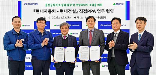 현대차는 23일 현대차 울산공장에서 현대건설과 태양광 재생에너지 PPA(Power Purchase Agreement·전력구매계약) 업무협약을 체결했다. 이날 협약식에는 현대차 국내생산지원담당 김진택 전무와 현대건설 개발사업부 최재범 전무 등 주요 관계자들이 참석했다.