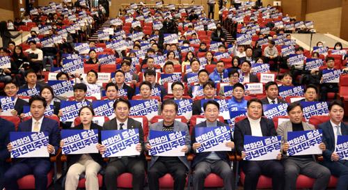 참석자들은 결의문을 낭독한 후 \'청년이 앞장서는 정권심판\',\'변화의 중심 청년 민주당\'이라고 적힌 피켓을 들고 구호를 외쳤다.