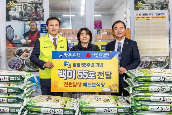 광주은행은 최근 창립 55주년을 맞아 광주 동구 대인시장 ‘해 뜨는 식당’에 백미 55포를 후원하며 지역사회에 온기를 더했다고 24일 밝혔다.