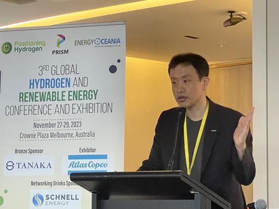 호주 멜버른에서 개최되고 있는 Positioning Hydrogen 2023 학회에서 황지현 교수가 Key Speaker 발표하고 있다. /한국에너지공대 제공