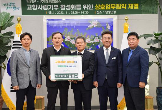 ㈜태영티에스는 도로 시설물 유지관리 업체로 김춘규 대표는 담양군 금성면 출신 향우로, 지난 9월 담양군 금성중학교 전교생 15명에게 각 50만 원의 장학금을 전달하는 등 평소에도 담양군을 위한 기부활동에 적극적으로 참여해 왔다. 이날 협약식에서도 김춘규 대표는 담양군에 고향사랑기부금을 기탁했다.