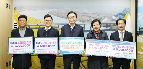 나주시는 반남면 향우인 용천산업(주) 나명균 대표, 토광건설(미르채) 나안균 대표, (유)예향조경 나영식 대표, ㈜하이옥스 이영례 대표가 고향사랑기부제 최고 한도 금액인 500만 원을 각각 기탁했다고 지난 1일 밝혔다.