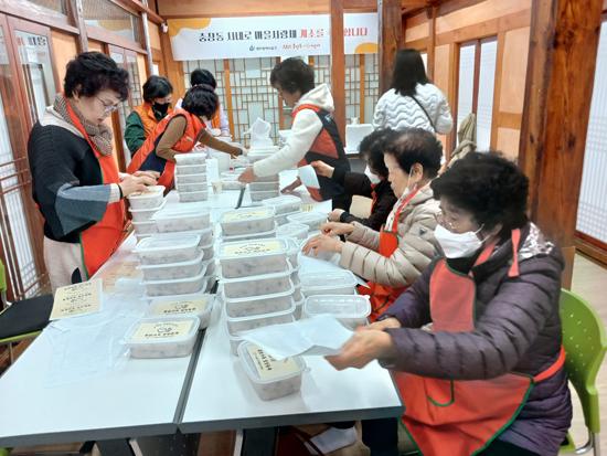 이달 행사에서는 돌봄 어르신과 자원봉사캠프 회원들이 사랑의 마음을 담아 100인분에 달하는 찰밥을 만들고 포장해 건강상의 이유로 식사 해결이 어려운 1인 가구마다 방문·전달하며 안부를 살폈다.