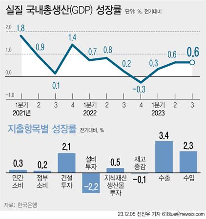 한국은행이 5일 발표한 \'2023년 3분기 국민소득(잠정)\'에 따르면 3분기 실질 국내총생산(GDP)은 전기 대비 0.6% 성장해 속보치와 같은 수준으로 집계됐다. 3분기 연속 플러스 성장이다. 전년 동기 대비 성장률은 1.4%로 나타났다.