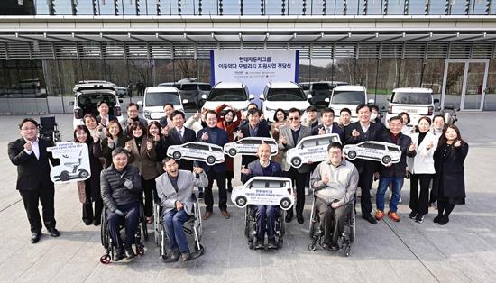 현대차그룹은 5일 기아 비전스퀘어(경기도 용인시)에서 현대차그룹 한용빈 부사장, 사회복지공동모금회 황인식 사무총장, 한국장애인복지시설협회 정석왕 회장, 한국척수장애인협회 정진완 회장, 한국장애인재활상담사협회 박경순 회장, 한국장애인단체총연맹 김동범 사무총장 등 관계자 40여 명이 참석한 가운데 ‘이동약자 모빌리티 지원사업 전달식’을 가졌다.