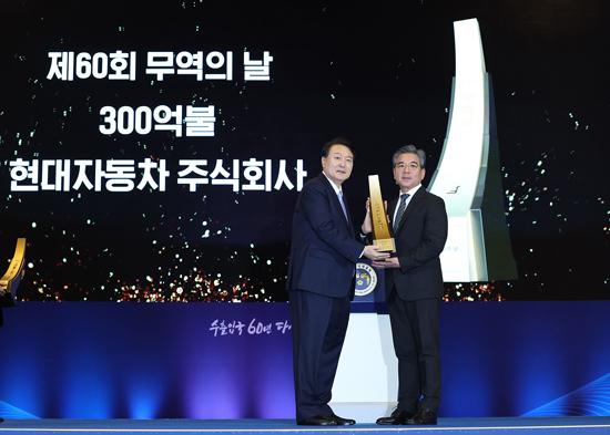 윤석열 대통령이 5일 서울 강남구 코엑스에서 열린 \'제60회 무역의 날 기념식\'에서 장재훈 현대자동차 대표이사 사장에게 300억불 수출의 탑을 수여하고 있다. 2023.12.05.