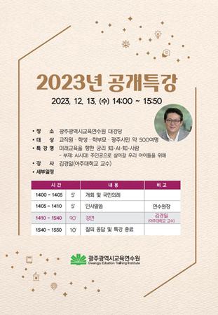 광주교육연수원이 오는 13일 교직원, 학생, 학부모를 비롯한 시민 대상으로 대강당에서 ‘미래교육을 향한 궁리 知·AI·知·사람(부제: AI시대! 주인공으로 살아갈 우리 아이들을 위해)’를 주제로 공개 특강을 실시한다.