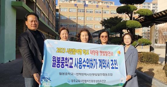 광주교육시민협치진흥원설립추진단이 지난 8일 월봉중학교와 일곡중학교에서 학교 햇빛발전소 건립을 위한 사용수익허가 계약을 반짝반짝햇빛발전협동조합, 일곡햇빛발전협동조합과 각각 체결했다고 밝혔다.
