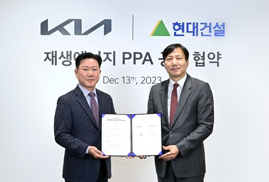 기아는 13일 서울 양재동 기아 본사에서 현대건설과 태양광 재생에너지 PPA(Power Purchase Agreement·전력구매계약) 업무 협약을 체결했다. 이날 협약식에는 기아 기업전략실 정의철 전무와 현대건설 개발사업부 최재범 전무 등 주요 관계자들이 참석했다.