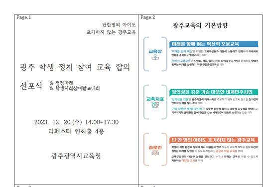 17일 시교육청에 따르면 이번 행사에서는 학생의 정치참여 활성화를 위한 ‘광주 학생 정치 참여 교육 합의’를 선포한다. 주요 합의 내용은 ▲정치적 중립성 교육 원칙 ▲토론식 교육 원칙 ▲현장 중심 교육 원칙 ▲민주·인권·참여 증진의 교육 원칙 ▲원론적 기초 정치 지식·정치제도·정보 교육 원칙 등 5개이다.