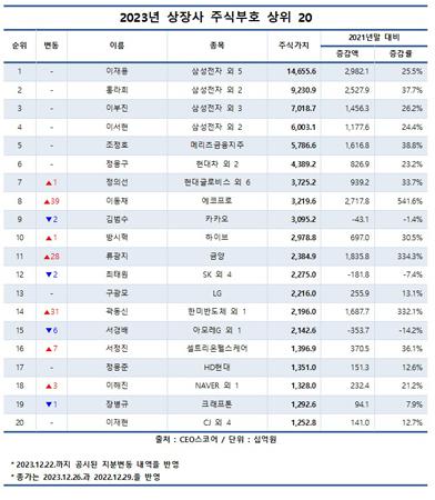 반면 주요 총수 중 김범수 카카오 창업자가 7위에서 9위(3조952억원)로, 최태원 SK그룹 회장이 10위에서 12위(2조2750억원), 서경배 아모레퍼시픽그룹 회장이 9위에서 15위(2조1426억원)로 지분가치가 줄며 전년 대비 순위가 밀렸다.