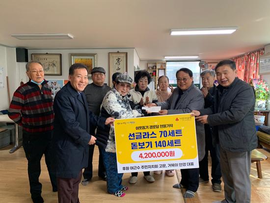 광주 동구 충장동은 새해를 맞아 여근수 거북이 안경 대표의 후원으로 관내 경로당 7개소에 총 420만 원 상당의 안경 돋보기(140세트)와 선글라스(70세트) 구매 쿠폰을 전달했다고 2일 밝혔다.