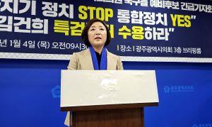 전 예비후보는 이날 오전 광주시의회에서 기자회견을 갖고 \"자신을 참신하고 젊은 세대임을 자처하는 한 위원장의 이런 이념적 갈라치기 행위는 낡은 수구보수 정치인의 언어·행위와 다르지 않다\"며 이 같이 밝혔다.