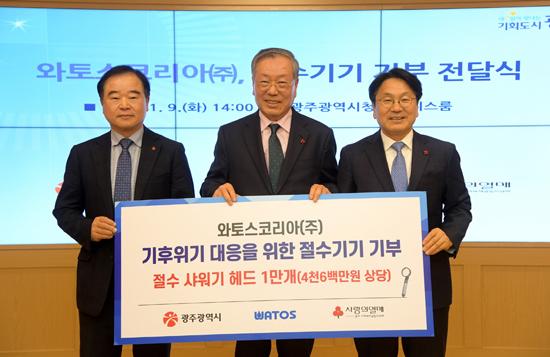 광주시는 9일 시청 비즈니스룸에서 와토스코리아㈜, 광주사회복지공동모금회와 함께 절수형 샤워기 헤드 기부 전달식을 가졌다.