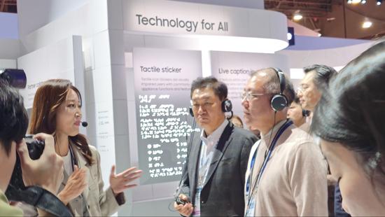 정의선 현대차그룹 회장은 CES 2024 개막 첫날 삼성전자 전시 부스를 방문했다. 정 사장은 한종희 삼성전자 대표이사 부회장과 함께 AI 동반자 로봇, 투명 마이크로 LED(발광다이오드) TV 등 신제품을 관람했다.