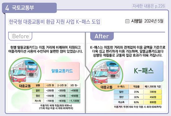 국토부는 당초 7월 시행을 목표로 K-패스 도입을 추진해 왔으나 국민 교통비 부담을 신속히 완화하기 위해 사업 전환 작업을 조속히 완료해 5월부터 조기 시행하고, 최소 이용횟수 조건도 월 21회에서 15회로 줄여 이용 장벽을 낮췄다.