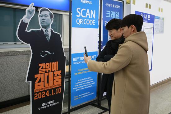 보해양조는 18일 목포역 내에 \'길 위에 김대중\' 영화를 홍보하는 등신대를 설치했다고 밝혔다. /보해양조 제공 2024.01.18