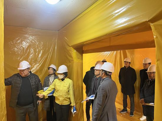 석면해체·제거 전 비닐 보양 작업을 점검하는 정성숙 교육장 및 점검단. /광주시교육청 제공