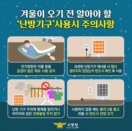 전기 난방용품을 안전하게 사용하기 위해선 ▲장기간 보관 후 재사용 시 열선 파손 여부 확인 ▲전기장판은 이불 등 겹겹이 덮은 채 사용 금지 ▲제품 근처 라이터 등 인화성 물품 두지 않기 등을 준수해야 한다. 또한 난방용품 구입 시 안전인증(KC마크) 제품 구입 ▲외출 시 전원과 플러그를 제거 ▲ 지나치게 장시간 사용하지 않기 ▲전기장판 보관 시 접는 행위 금지 등 안전수칙을 준수해야한다.