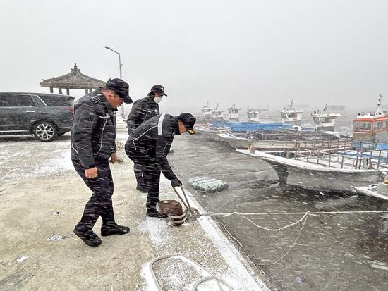 이에 이 서장은 직접 관내 전 해상 풍랑주의보 및 눈보라가 치는 상황에서 어란진·구성항 및 도선 선착장을 방문, 정박어선 고박상태 및 이용객들의 미끄럼 예방을 위한 안전시설물·선착장에 대한 집중점검을 실시했다.
