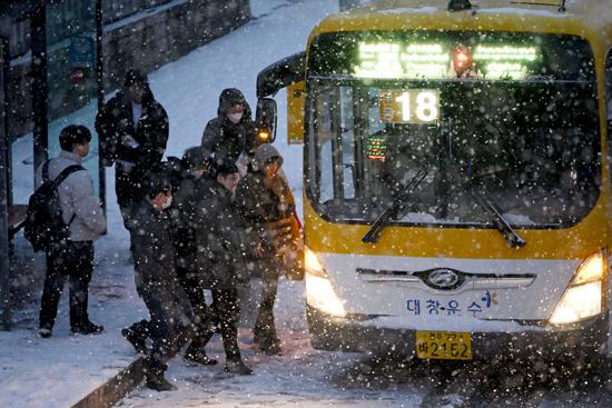 쏟아지는 눈발을 헤치고 출근 채비를 갖춰 나온 시민들은 시린 볼을 비비며 시내버스를 기다렸다.