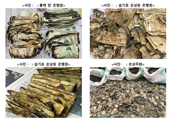 주요 손상화폐 교환 사례를 보면 서울에 사는 이 모씨는 자택 화재로 불에 탄 은행권 1910만원을 교환했고, 광주에 사는 정모씨는 연못에서 수거한 손상 주화 339만원을 교환했다.