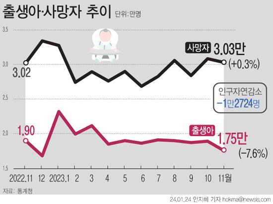 통계청이 24일 발표한 \'2023년 11월 인구동향\'에 따르면 지난해 11월 출생아 수는 1만7531명으로 전년 같은 달보다 1450명(-7.6%) 감소했다. 1만7000명대는 역대 처음이다.