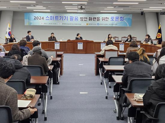 광주시교육청이 지난 24일 광주시의회 및 광주교육시민연대와 공동으로 시의회 예산결산특별위원회 회의실에서 ‘2024 스마트기기 활동 방안 마련을 위한 토론회’를 개최했다.