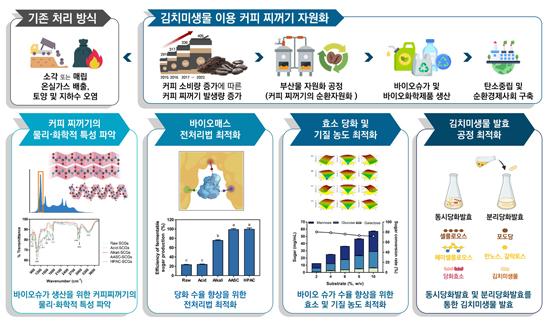 세계김치연구소 발효조절기술연구단 김호명 박사 연구팀은 생물학적 전환 방법을 통해 커피 찌꺼기로부터 바이오슈가를 추출하고, 이를 김치미생물 발효를 통해 고 수율의 젖산으로 전환하는 데 성공했다.