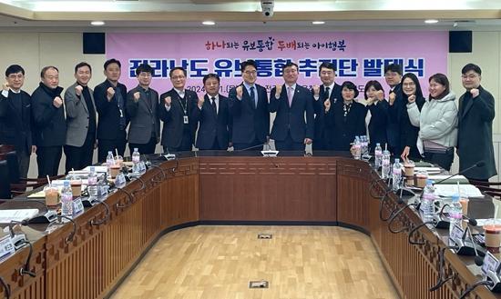 전남도유보통합추진단이 1일 전남교육청 상황실에서 발대식을 가진 뒤 기념촬영을 하고 있다. /전남교육청 제공 2024.02.01