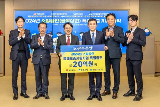 광주은행은 2일 광주광역시청에서 강기정 광주시장을 비롯해 고병일 광주은행장, 김귀남 광주신용보증재단 이사장 등이 참석한 가운데 \'2024년 소상공인 특례 보증 대출 지원사업 협약\'을 체결했다.