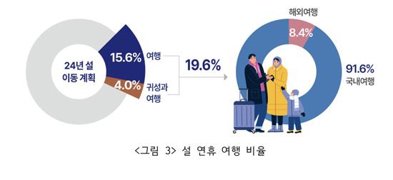 올해 설 연휴 기간에 여행을 간다고 응답한 비율은 전체의 19.6% 수준이다. 그중 91.6%가 국내여행, 8.4%가 해외여행을 간다고 응답했다.