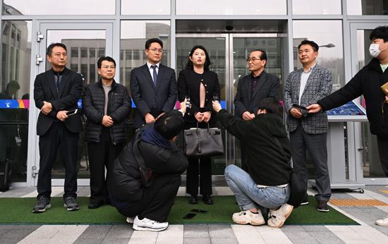 15일 오전 광주 동구 광주지방법원 별관 앞에서 일제강제노역 피해자 지원 변호인단과 유족이 취재진을 향해 강제노역 피해자들이 제기한 소송 1심 결과와 소회를 밝히고 있다. 2024.02.15