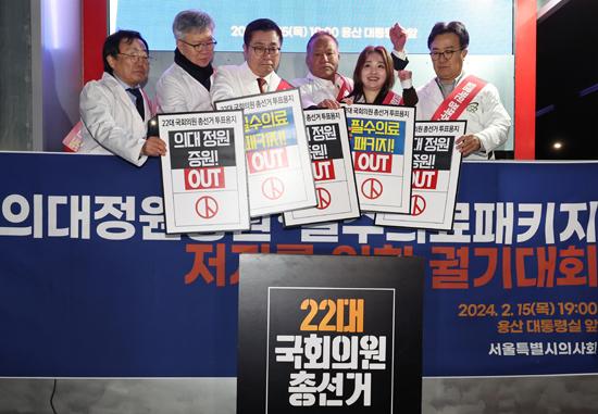 정부의 의과대학(의대) 정원 확대에 반발한 의사단체가 15일 대통령실 인근에서 집회를 열고 정책 철회를 촉구했다.