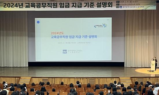 광주시교육청이 19일 공립학교와 산하 기관의 업무 담당자 300여 명이 참여한 가운데 광주교육연수원 대강당에서 ‘2024년도 교육공무직원 임금 지급 기준 설명회’를 개최했다.