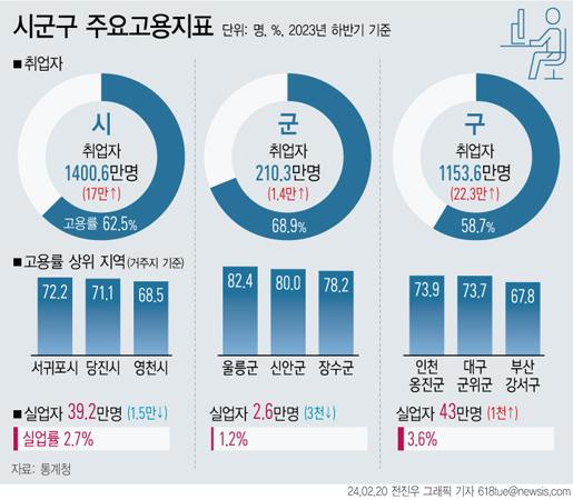 통계청은 20일 이런 내용을 담은 \'2023년 하반기 지역별 고용조사 시군구 주요고용지표\'를 발표했다. 이번 통계는 지난해 10월 기준 전국 228개 시군구의 주요 고용지표 분석한 결과다.