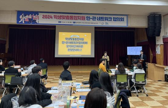 광주서부교육지원청이 지난 20일 광산구, 서구, 남구 지역 구청-경찰서-복지기관-민간기관-NGO단체 담당자 50여 명과 함께하는 ‘2024 학생맞춤통합지원 민-관 네트워크 협의회’를 개최했다.