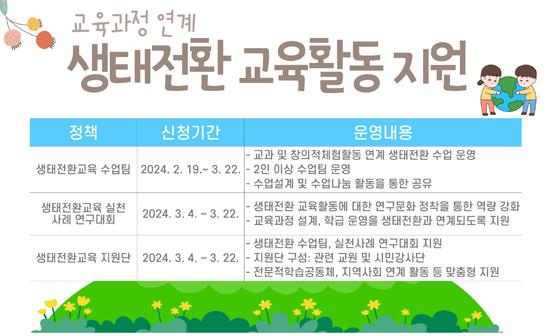 ‘생태전환교육 지원단’은 관내 교원과 지역사회 활동가를 중심으로 구성해 ‘생태전환교육 수업팀’과 ‘실천사례 연구대회’를 지원하는 역할을 한다. 또한 학교 현장에서 생태전환교육 수업에 관심있는 교사들에게 전문적 학습공동체 구성 및 지역사회 연계 활동 등 맞춤형 지원을 할 예정이다.