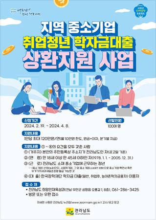 전남도가 중소기업에 취업한 청년을 대상으로 학자금 대출 상환 지원 대상자를 4월 8일까지 모집한다.
