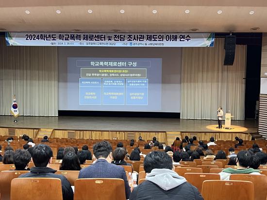 한편 광주동·서부교육지원청은 2월 28일 학교 현장에서 학교폭력제로센터 운영에 대한 이해를 돕기 위해 학교 교감 및 학생생활부장 대상 연수를 실시했다. 이를 통해 제로센터 구축 현황 및 운영 사업에 대한 안내와 학교폭력 사안 처리에 대한 주요 개정 사항을 안내했다.