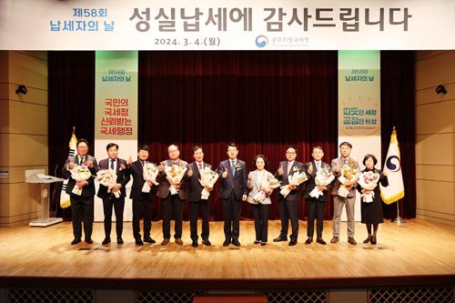 광주지방국세청은 4일 오전 정부광주지방합동청사 대강당에서 제58회 \'납세자의 날\' 기념식을 갖고 성실납세와 나눔문화 확산을 위해 기여한 모범납세자와 세정협조자에게 포장과 표창장 등을 전수했다.