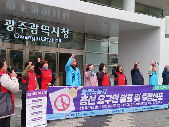 민주노총 서비스연맹 전국돌봄서비스노동조합 광주지부가 5일 오전 광주 서구 광주시청 앞에서 \'돌봄노동자 총선 요구안 발표·투쟁선언\' 기자회견을 열고 \"돌봄 노동자들은 저임금과 낮은 처우로 인해 노동현장에서 내몰리고 있다\"며 이같이 밝혔다.