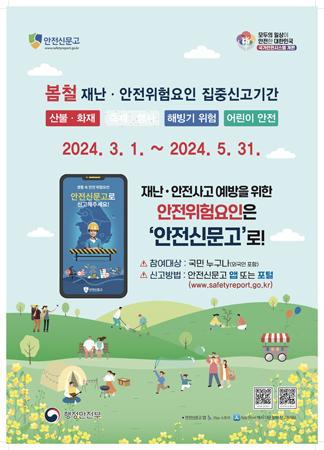 이번 봄철 집중 신고 대상은 ▲불법 소각 등 산불·화재 ▲인파 밀집 등 축제·행사 ▲붕괴, 낙석 등 해빙기 위험 ▲통학로, 놀이시설 등 어린이 안전 총 4개 유형이다.