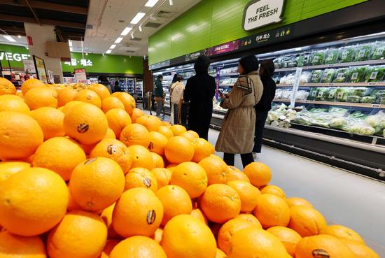 한국농촌경제연구원 \'농업관측 3월호\' 보고서에 따르면 이번달 과일, 채소 가격이 높은 수준을 유지하거나, 작년 동월보다 더 오를 것으로 예상된다. 이는 과일과 채소 출하량이 감소했기 때문으로 분석된다. 사진은 11일 서울의 한 대형마트 과일, 채소 코너 모습. 2024.03.11