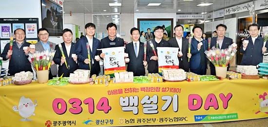농협광주본부는 13일 광주 광산구청에서 매년 3월14일로 정한 \'백설기 데이\'를 널리 알리고 쌀 소비 촉진을 위해 백설기 나눔 행사를 성황리에 개최했다.
