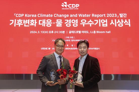 현대차 경영전략3실장 황동철 상무, 기아 안전환경지원팀 임기동 팀장이 \'2023 CDP 코리아 어워드(CDP Korea Award)\'에서 기념사진을 촬영하고 있다. /현대차·기아 제공