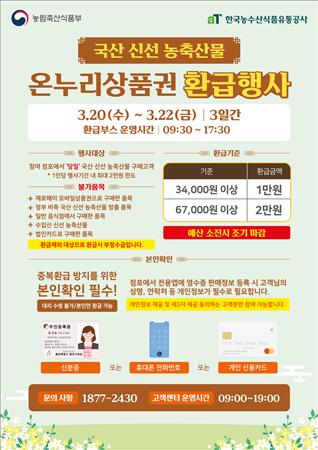 소비자들은 행사를 여는 각 시장에서 국산 신선 농축산물을 산 후 영수증·신분증을 지참해 시장 내 환급부스에서 환급이 가능하다. 행사 참여 시장 등 자세한 내용은 공식 누리집(sale.foodnuri.go.kr)에서 확인할 수 있다.